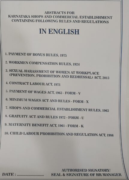 LABOUR ABSTRACTS DISPLAY FOR KARNATAKA SHOPS AND COMMERCIAL ESTABLISHMENT CONTAINGING FOLLOWING RULE AND REGULATITONS -DISPLAY