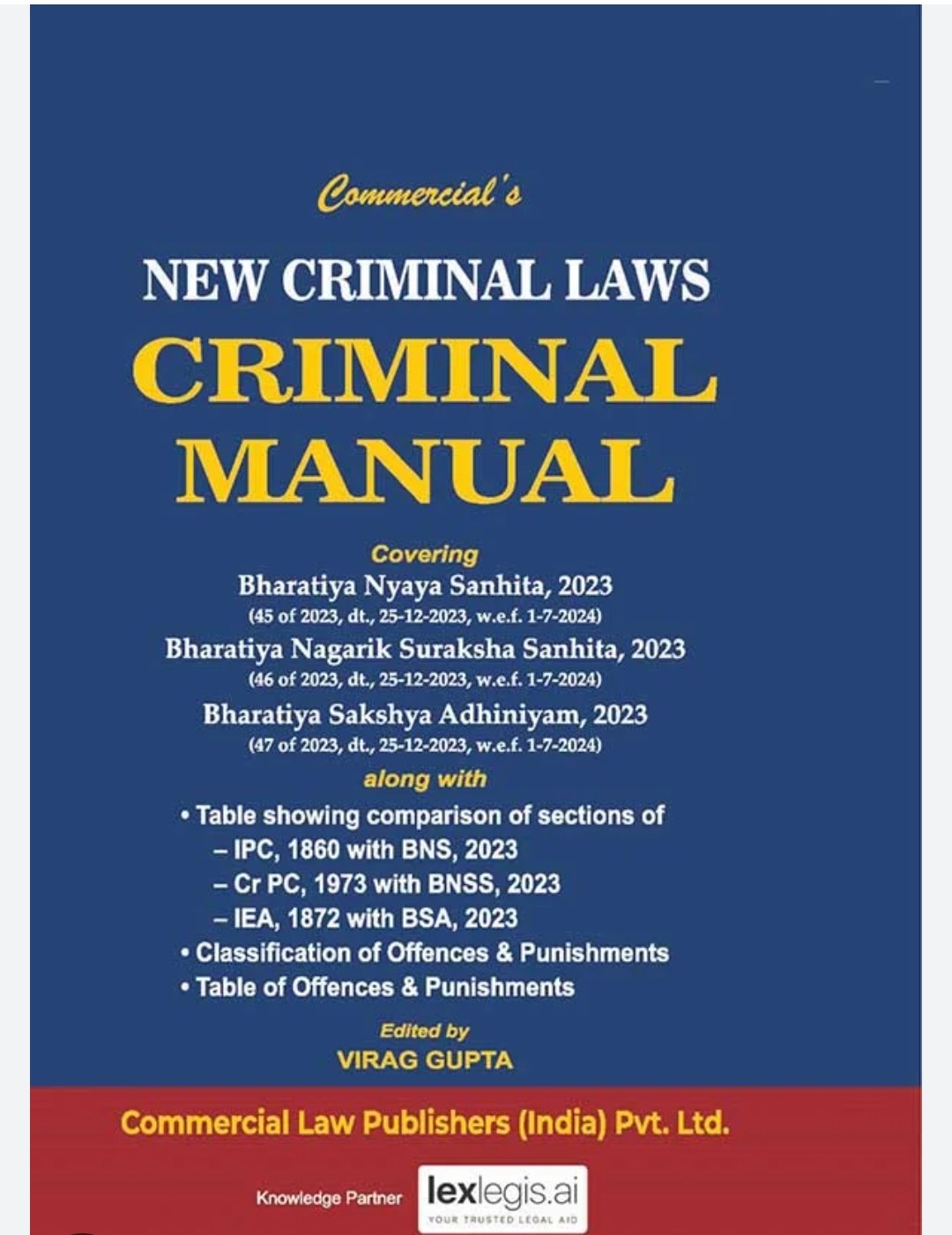 This edition of Commercial’s New Criminal Laws Criminal Manual (2026 Edition) serves as a comprehensive legal reference encompassing the newly enacted criminal law codes of India. It covers the Bharatiya Nyaya Sanhita, 2023 (Act 45 of 2023), Bharatiya Nagarik Suraksha Sanhita, 2023 (Act 46 of 2023), and Bharatiya Sakshya Adhiniyam, 2023 (Act 47 of 2023)—which collectively replace the Indian Penal Code, 1860; the Code of Criminal Procedure, 1973; and the Indian Evidence Act, 1872. The manual provides an authoritative and updated compilation of these statutes in a clear and accessible format for legal practitioners, students, and academicians. It includes a comparative table showing the correspondence between the repealed laws (IPC, CrPC, and IEA) and the new enactments (BNS, BNSS, and BSA), aiding users in understanding the structural and substantive changes. Additional features include classifications of offences and punishments, and a detailed table of offences under the new framework. Authored by Virag Gupta, this manual is published by Commercial Law Publishers (India) Pvt. Ltd., and is an indispensable resource for those engaged in criminal law practice, judicial service examinations, and academic research in the evolving Indian criminal justice system.